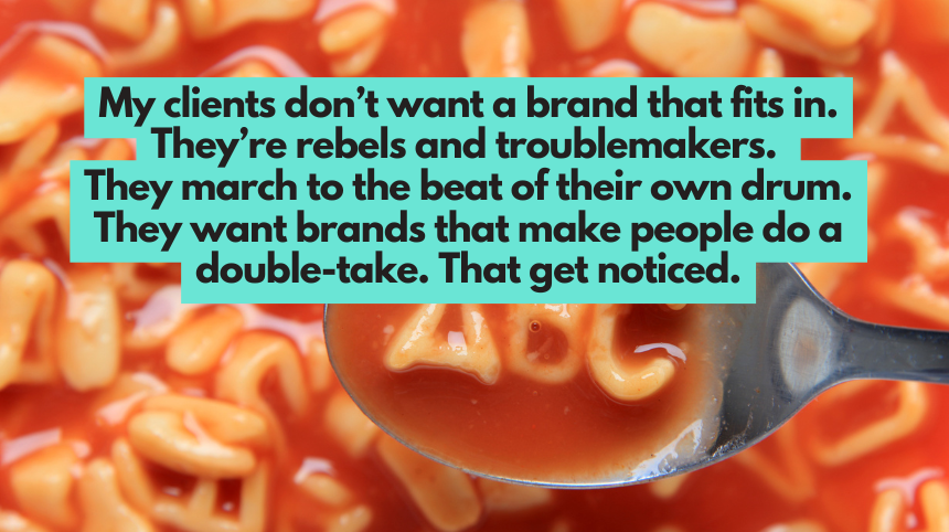 And most often, my clients don’t want a brand that fits in with their industry. They’re rebels and troublemakers. They march to the beat of their own drum. They want brands that make people do a double-take. That get noticed.